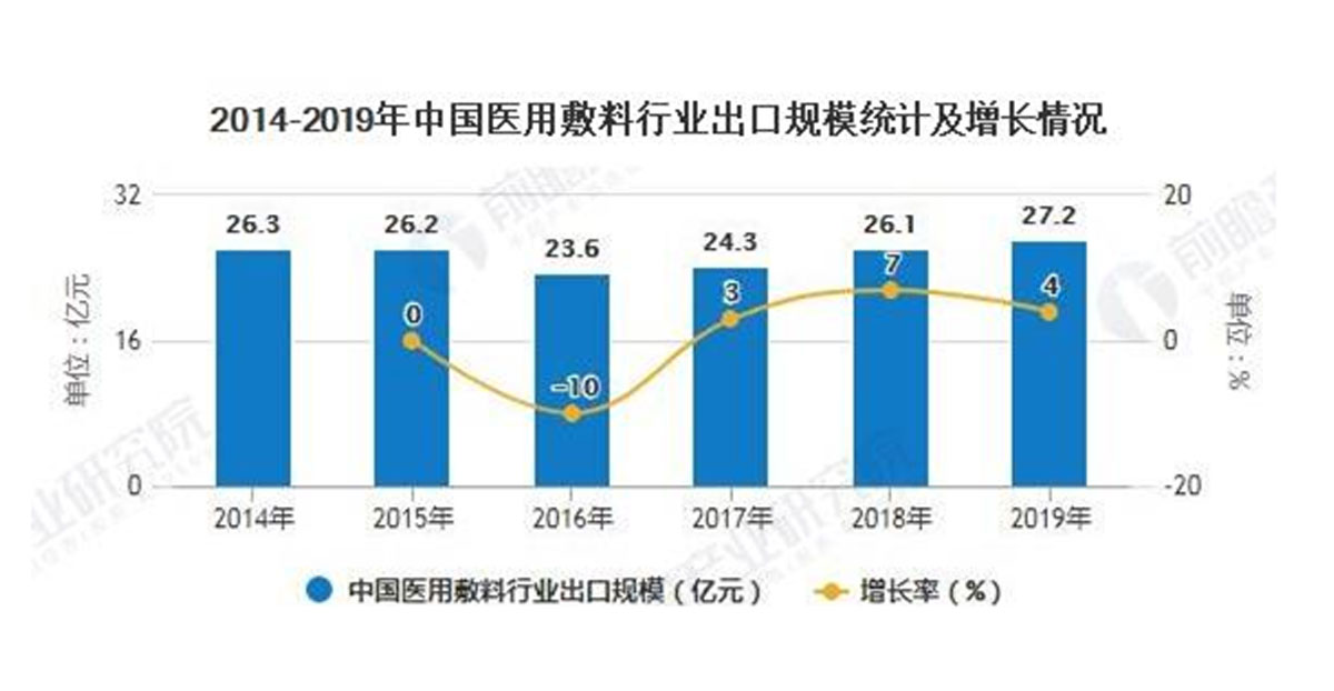 根據(jù)中投產(chǎn)業(yè)研究院發(fā)布的《2021年中國醫(yī)用敷料市場(chǎng)調(diào)研報(bào)告》,醫(yī)用敷料,是指用以覆蓋瘡、傷口或其他損害的醫(yī)用材料,屬于醫(yī)療器械中的護(hù)理和防護(hù)器械。近年來,隨著我國醫(yī)療條件的改善和居民健康意識(shí)、消費(fèi)水平的提升,我國醫(yī)用敷料市場(chǎng)穩(wěn)步增長。2019年,我國醫(yī)用敷料市場(chǎng)規(guī)模約73.12億元。2020年1-9月中國醫(yī)用敷料出口數(shù)量為16.14萬噸,同比增長0.5%;出口金額為13.14億美元,同比增長14.5%。